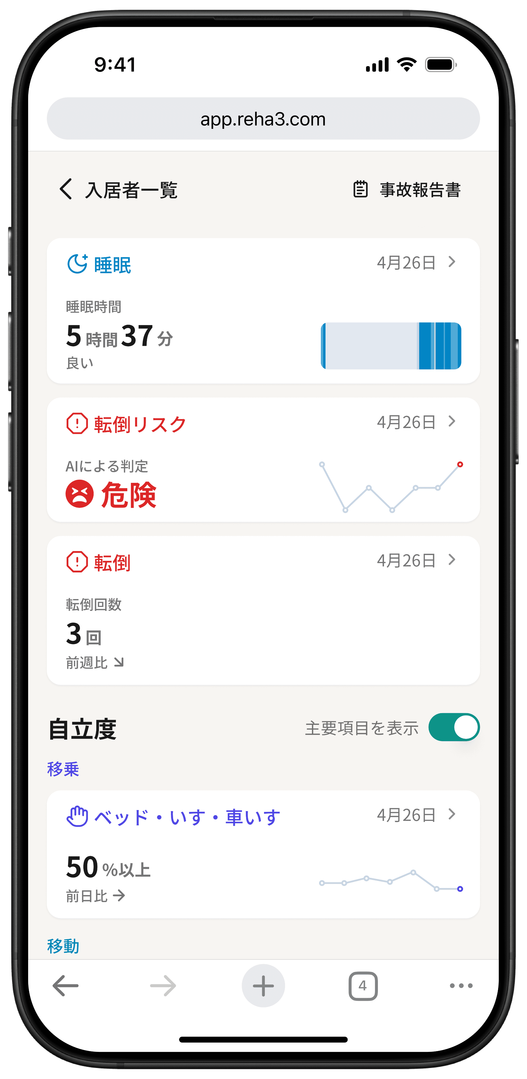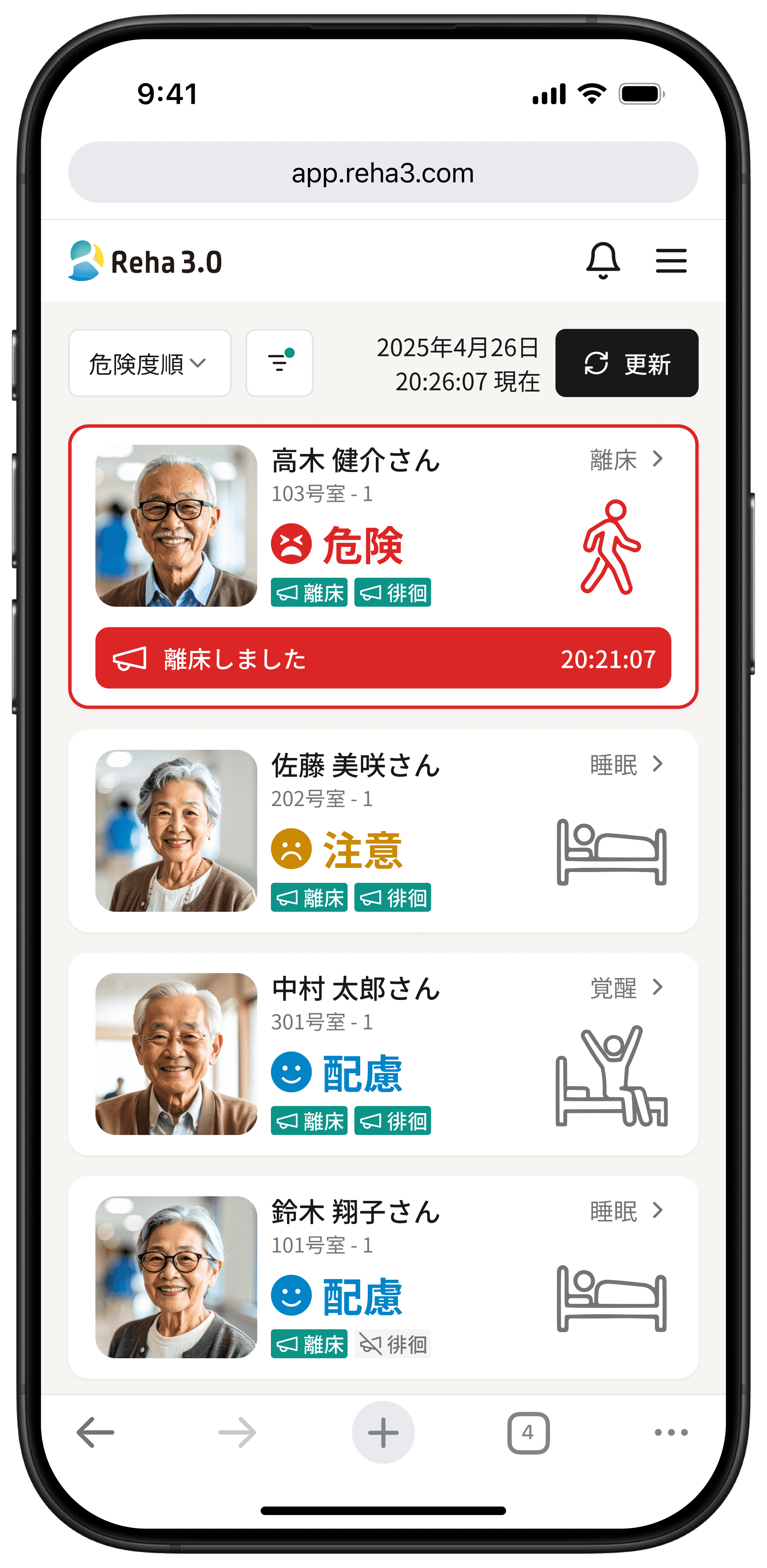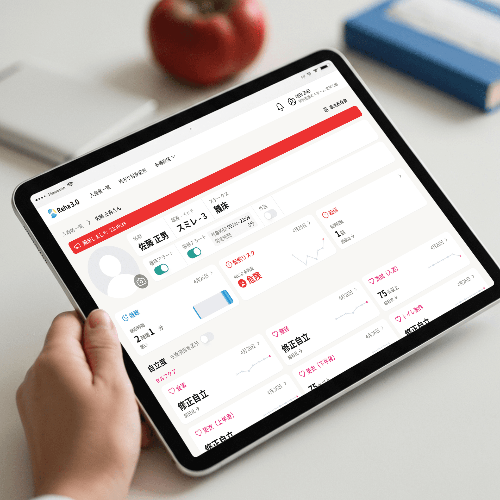 「転倒リスクが高いと思っていた方のアラートが鳴っても、実際には危険行動につながらないことが多く、正直心が折れる場面がありました。逆に“安全だろう”と思っていた方が突然転倒することもあります。今は Reha3.0 が事前に予測し、根拠ある客観データも残してくれるので、判断がスタッフ個人の責任にならず、気持ちがとても楽になりました。」